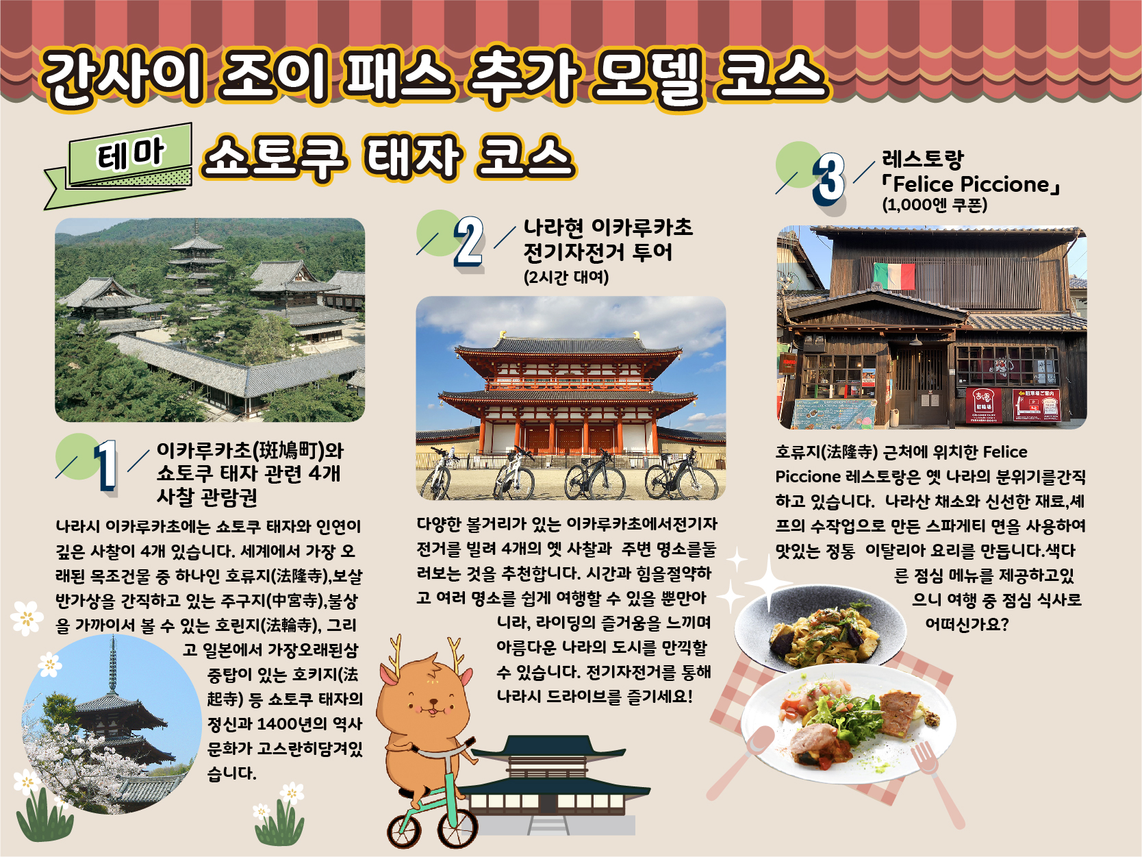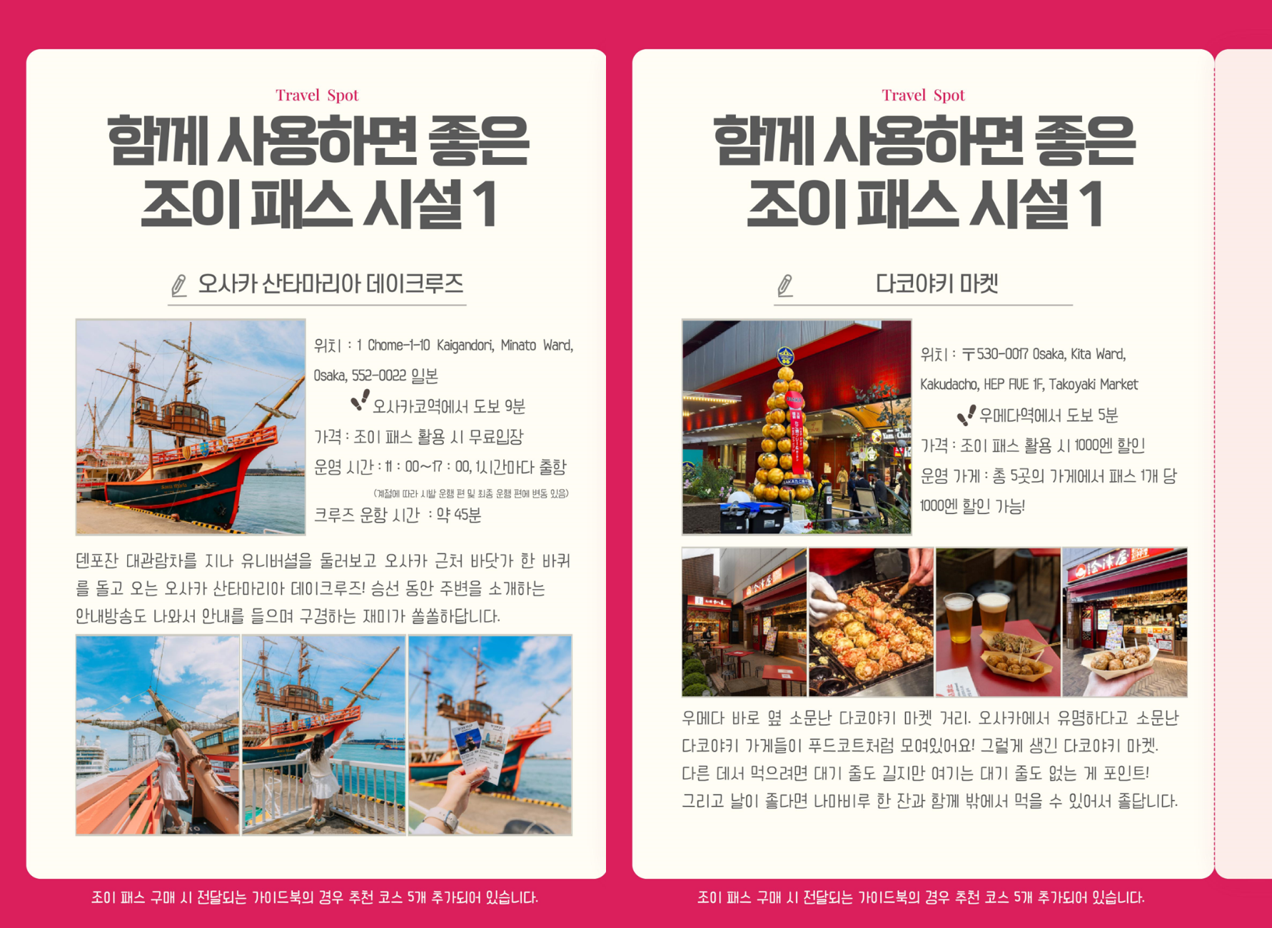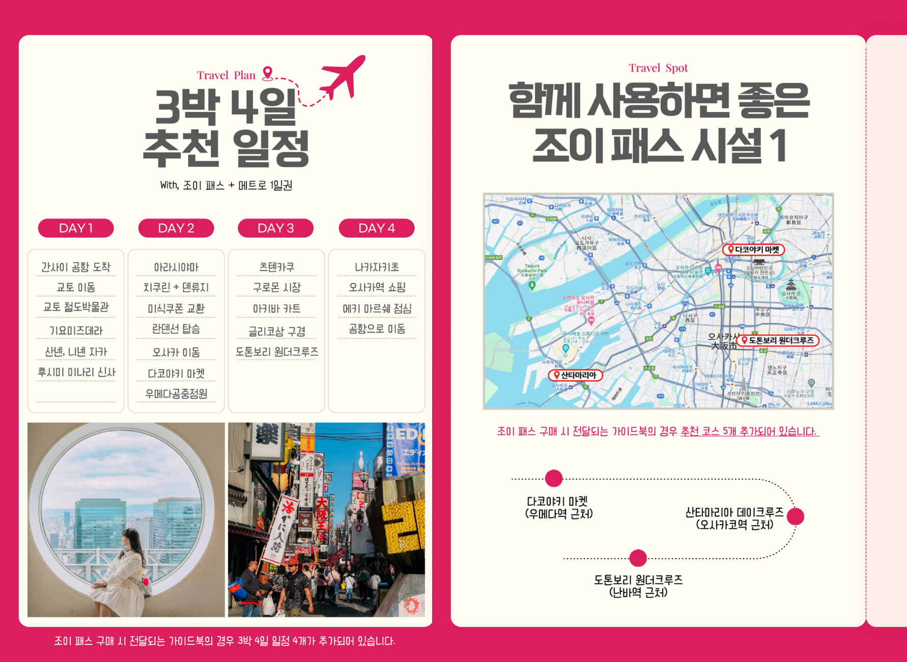 일주일 간 간사이 주요 시설 3곳 or 6 곳 선택! 일본의 오사카, 교토, 고베, 나라 등의 도시가 위치한 간사이 지역을 여행하는 분들에게 유용한 관광패스 🎫 한 개의 QR코드를 모바일에 저장해서 보관도 편리합니다. 다양한 시설들을 일주일 동안 3곳 또는 6곳의 시설을 저렴한 가격으로 이용할 수 있습니다! 야경부터 시작하여, 먹거리, 교통, 패러글라이딩까지 다양한 장르의 상품을 이용할 수 있습니다. 저렴한 가격으로 간사이 지역 명소를 입장할 수 있을 뿐만 아니라, 식당, 기념품, 교통까지 폭 넓은 혜택을 받아보세요 *간사이 조이 패스로 이용 가능한 추천 여행 상품 [체험시설] [오사카] ① 쓰텐카쿠 입장권 ② 쓰텐카쿠 "TOWER SLIDER" 티켓 ③ 쓰텐카쿠 Dive & Walk 2000엔 할인 ④ 오사카 원더 크루즈(17시 이후 운행편만 이용 가능합니다.) ⑤ 산타마리아 데이 크루즈 승선권 (동계시즌 특별운휴일: 25.02.19-25.02.20 ) ⑥ 우메다 스카이 빌딩 공중정원 전망대 입장권 ⑦ 하루카스 300 전망대 ⑧ 레고랜드 디스커버리 센터 오사카 입장권 (사전예약이 필요합니다.) ⑨ 소라니와온천 OSAKA BAY TOWER (A, B 요금 날짜만 이용이 가능합니다.) ※소라니와온천이용 불가일 ❎2025년 4월: 5일, 6일, 12일, 13일, 16일, 19일, 20일, 26일, 27일, 29일 ❎2025년 5월: 3일, 4일, 5일, 6일, 14일, 24일, 25일 ❎2025년 6월: 11일, 15일, 21일, 22일, 28일, 29일 ※이용 가능 일자는 링크를 참고해 주세요. 이용날짜 확인하기 [고베] ⑦ 고베 누노비키 허브가든 & 로프웨이 입장권 왕복 ⑧ 모자이크 대관람차 [교토] ⑨ 교토 철도 박물관 ⑩ 도에이 우즈마사 영화촌 입장권 [쇼핑] [오사카] ① 오사카역 쇼핑센터 "LUCUA osaka" 공통 상품권 1000엔 ② 오사카역 쇼핑센터 "EKI MARCHE 오사카" 공통 쿠폰 1000엔 ③ 덴노지 MIO 쇼핑몰 공통 쿠폰 1500엔 (2023.9.1~2024.9.30) [맛집] [오사카] ① 오사카 레스토랑 플로어 "16 Gourmet" 식사권 1300엔 ② 298 야키니쿠 1000엔 할인 ③ 노노토리 1000엔 할인 ④ 기타신치 쿠시카츠 본 1000엔 할인 ⑤ 아베노다코야키 야마짱 유니버설 시티워크 오사카점 1000엔 할인 ⑥ 다코야키 다마야 유니버설 시티워크 오사카점 1000엔 할인 ⑦ 오사카 아메리카무라 고가류 유니버설 시티워크 오사카점 1000엔 할인 ⑧ Dotonbori Grill & Bar Wonder 1000엔 할인 ⑨ 스키야키 샤부샤부 만스이야 1000엔 할인 ⑩ ABURIYA arata KITTE OSAKA 1000엔 식사 할인 [고베] ⑩ 톤톤 돈카츠 1000엔 할인 (세트메뉴 이용) [교토] ⑪ 카니카니랜드 교토기온점 1000엔 할인 [교통] [오사카] ① 오사카 공유 자전거 1일 패스 (IC카드 포함) [교토] ② 게이한 전철 오사카-교토 1일권 ③ 교토 아라시야마 미식 투어 쿠폰 + 란덴 1일 승차 가이드북 링크 이용가능시설 구글맵 영상보러가기